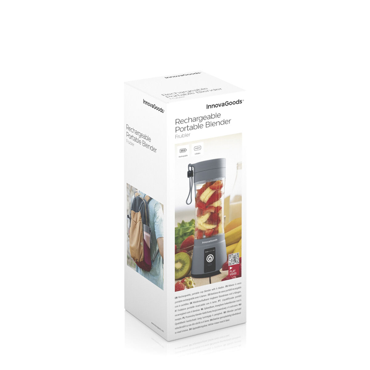The Frubler InnovaGoods portable rechargeablecup blender is ideal for making natural shakes, juices and smoothies athome, at the office, at the gym, etc. with total convenience. This rechargeable blender has 6 blades andan internal outlet filter to pour the contents so they are ready to drink,without any lumps or pulp. Its compact and portable design means it can betaken anywhere easily, in your bag, backpack, etc. It also has a carrying strapon the lid and it can be taken apart easily for cleaning.